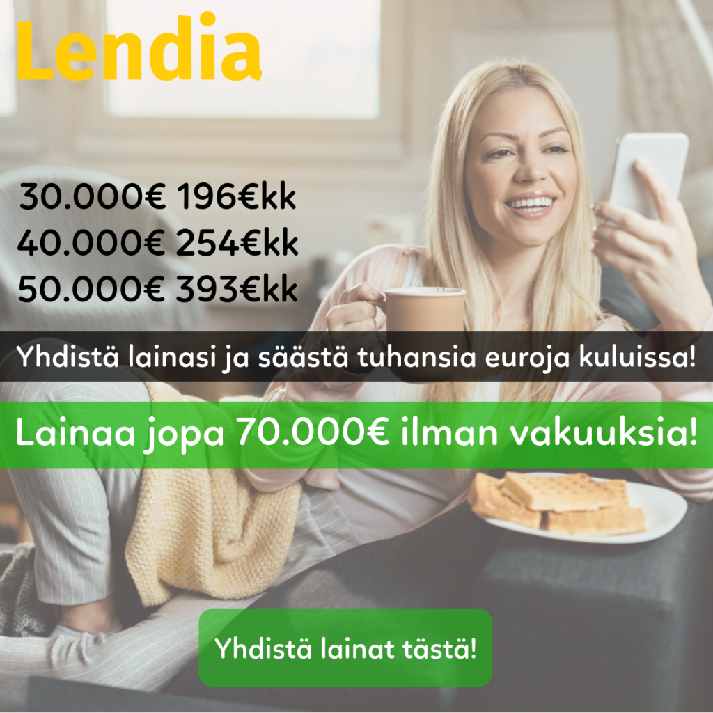 Lendia on erikoistunut isojen yhdistelylainojen kilpailutukseen! Lendian kautta on erityisen helppoa saada 20.000 – 70.000€ kokoisia yhdistelylainoja! Lendialla on kymmeniä tuhansia tyytyväisiä asiakkaita Suomessa!